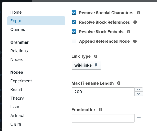 - control whether you want to resolve block references/embeds in your export. You can keep this turned off if you are unsure of the privacy implications of references/embeds.